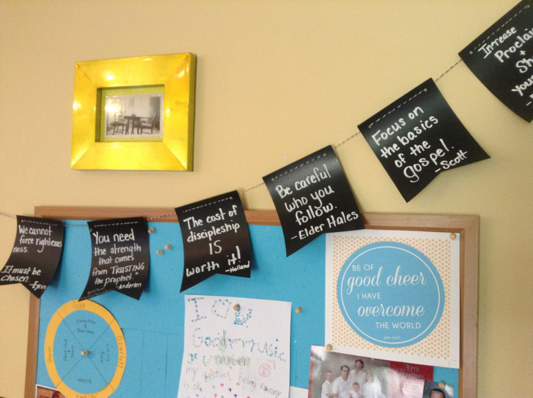 General conference means so much to our family. This year we made a banner using chalkboard paper to take notes during conference. We wrote the most notable phrase from each speaker on a pendant of our banner. As soon as conference was over, we already had the words of the prophets displayed in our home as a reminder for our family to look to in the coming months. When the next general conference comes, we can erase the banner and start again. Families can easily make a similar banner of their own using card stock, string, and a hole punch.