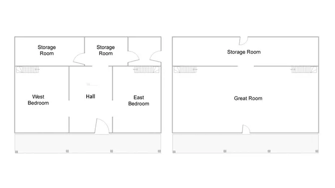 Ground floor (left) and second floor (right) of the Jacob Hamblin Home. Note the rear storage rooms added to both floors in 1866.