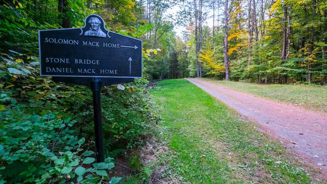 By following the road to the north of the monument, you can drive into a wooded area and see the original foundations of homes that once belonged to Solomon Mack and Daniel Mack—Joseph Smith’s grandfather and uncle, respectively. As you travel down the historic roadway, be sure to stop and see the remains of a historic stone bridge and rock wall.