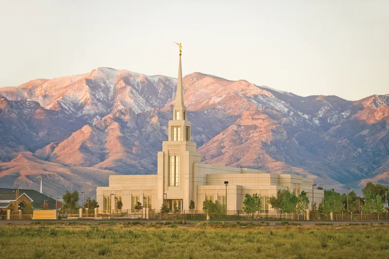 The Gila Valley Arizona Temple, with a large mountain range in the background.