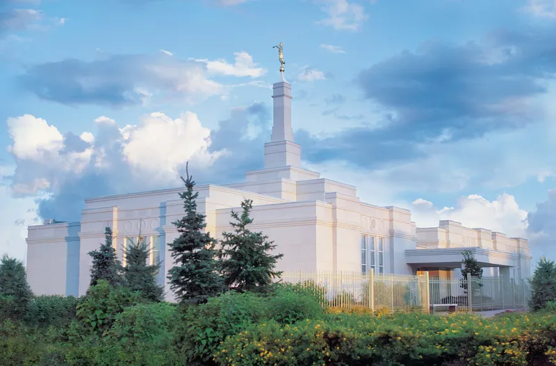 The Regina Saskatchewan Temple, with bushes and evergreen trees growing nearby.