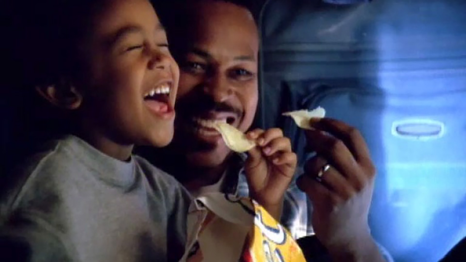 A father and his son eat a snack.