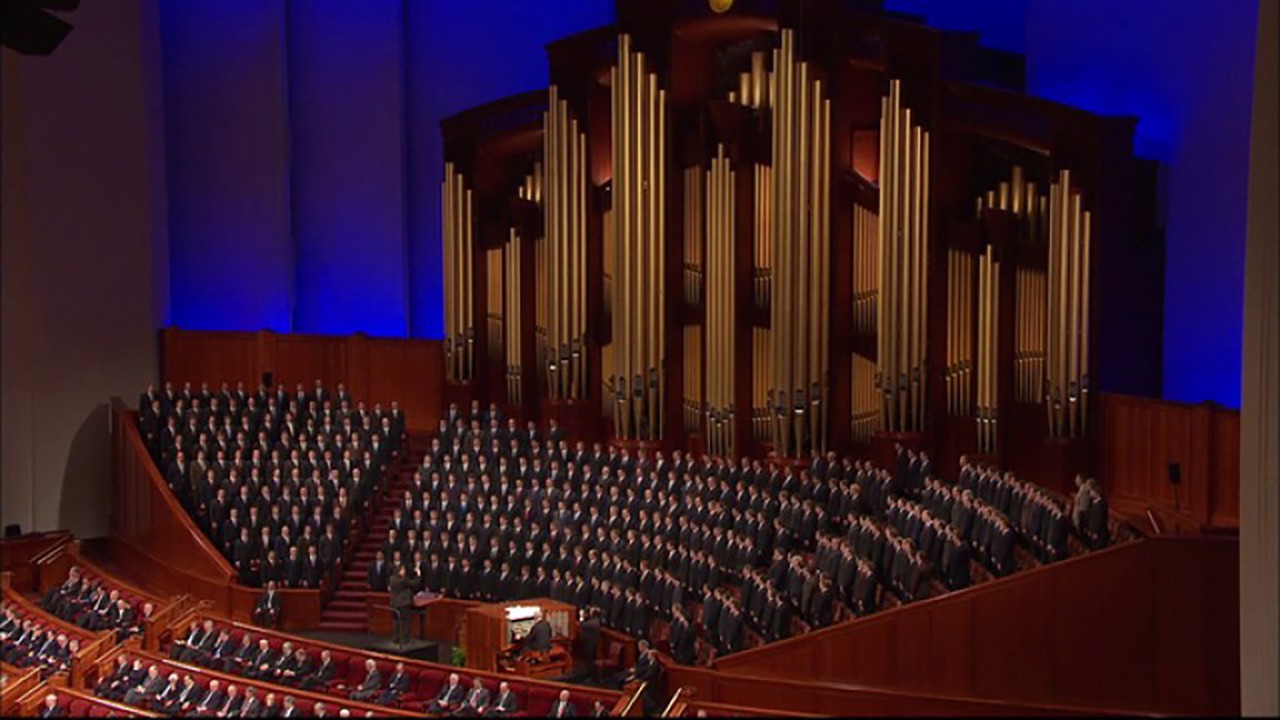 A priesthood choir from Brigham Young University sings “God Loved Us, So He Sent His Son.”