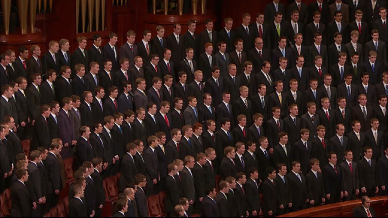 A priesthood choir from Brigham Young University sings “Choose the Right.”