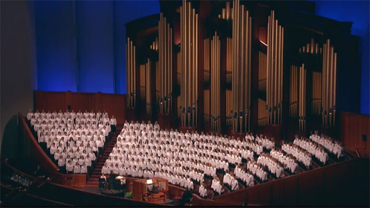 A Relief Society choir from stakes in Kearns sings “Carry On.”