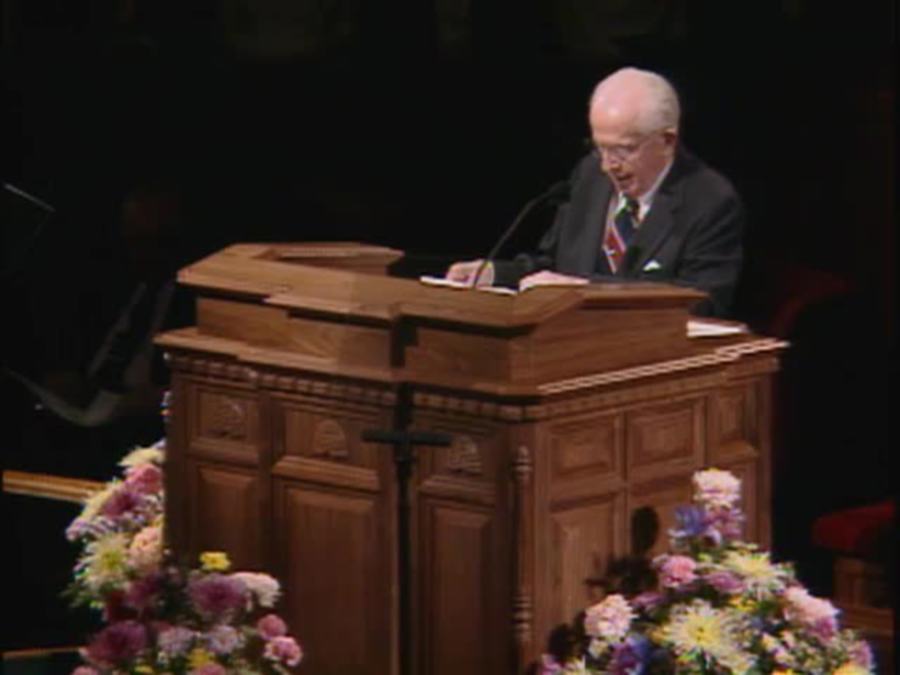 (모세서 7:18) 벤슨 회장이 교회 회원들에게 인생에서 하나님을 첫째로 두라고 가르친다.