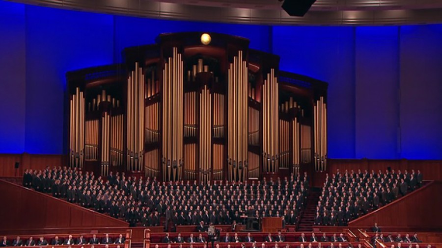 A priesthood choir from the Logan and Ogden institutes of religion sings “See the Mighty Priesthood Gathered.”