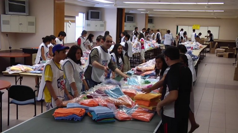 Young single adults attending institute in Santiago gather to prepare hygiene kits for victims of the earthquake.