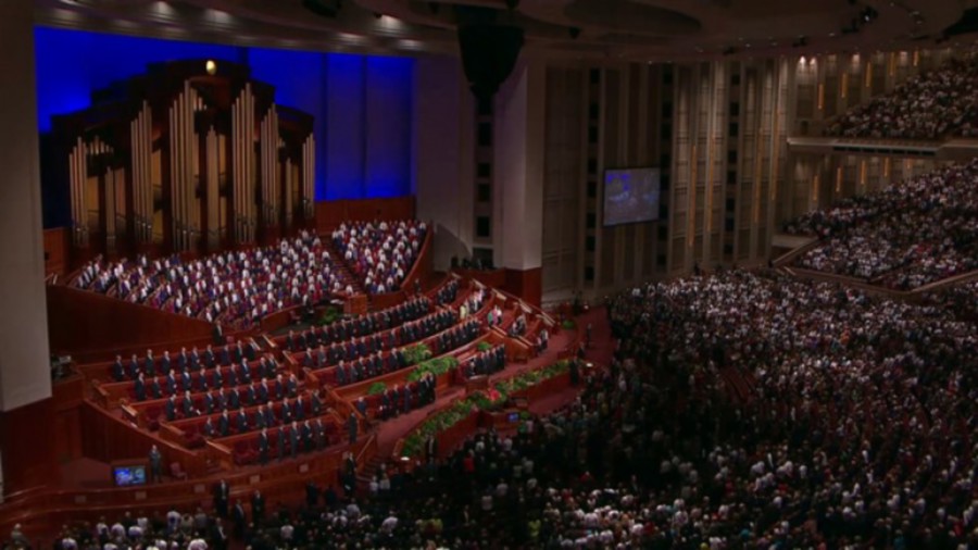 The choir and congregation sing “Praise to the Man.”