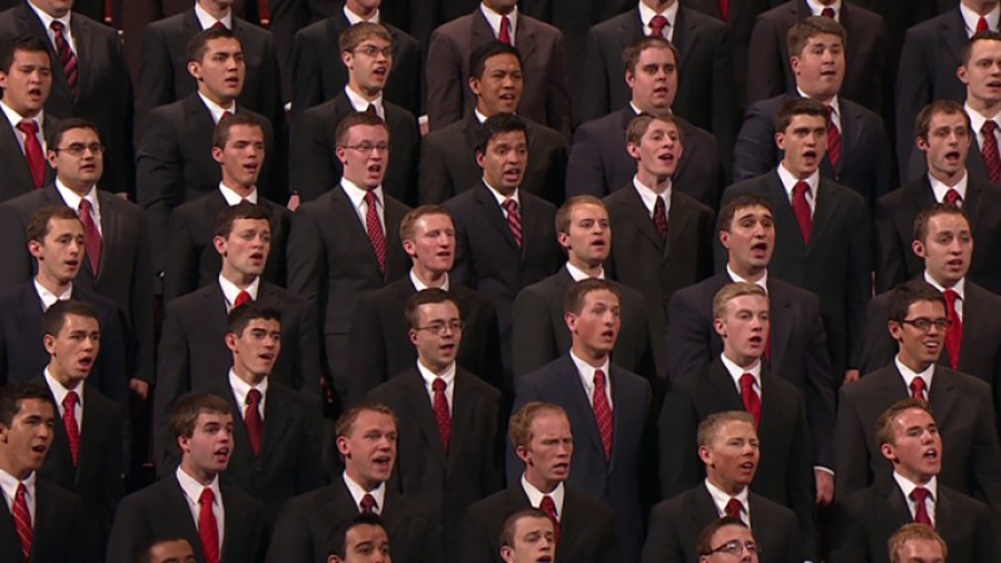 A priesthood choir from the Salt Lake area institutes of religion sings “Dear to the Heart of the Shepherd.”