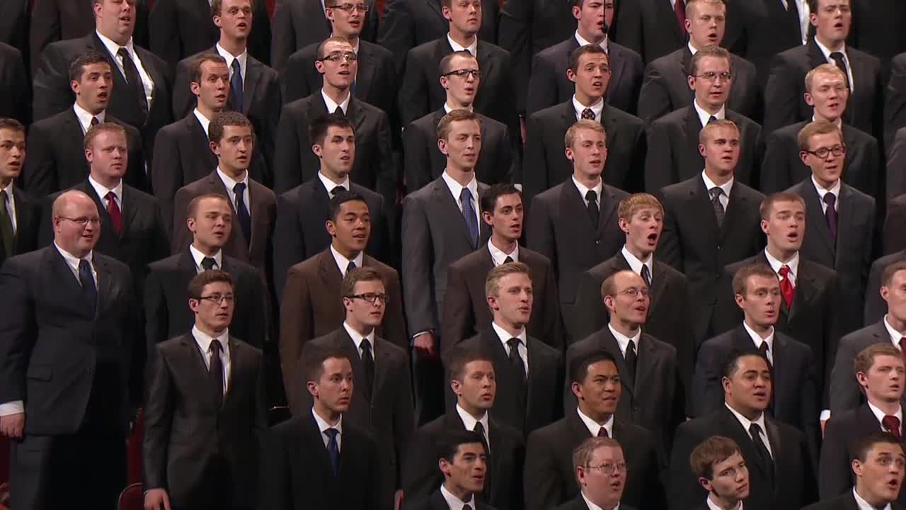 A priesthood choir from YSA stakes in Salt Lake sings “Arise, O God, and Shine.”