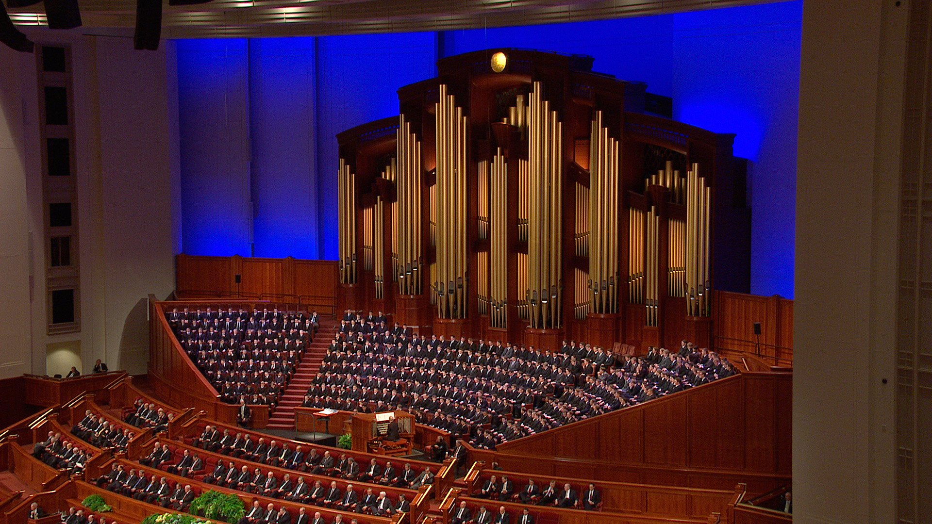 An Aaronic Priesthood choir from stakes in Murray sings “Sing Praise to Him.”