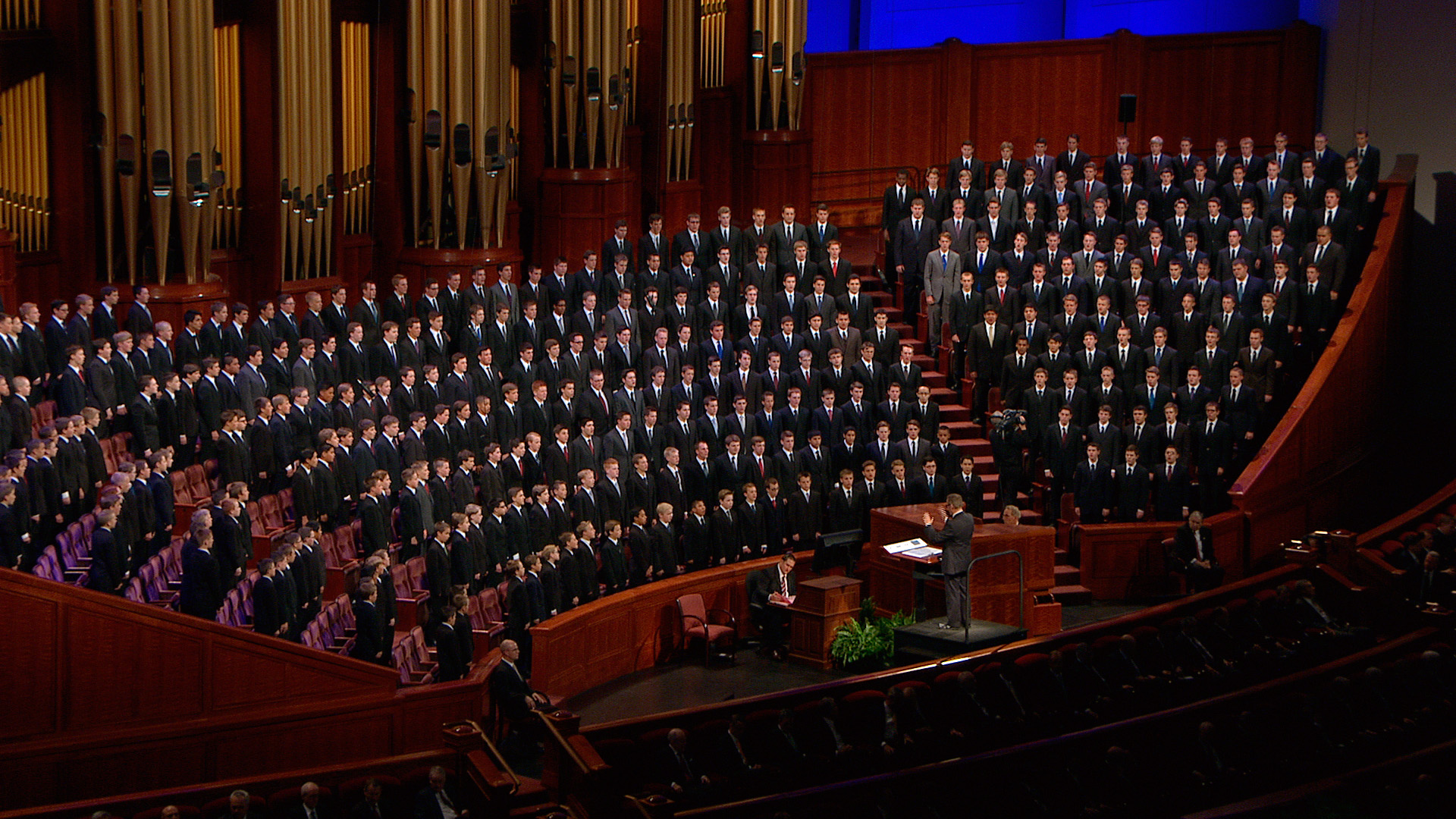 An Aaronic Priesthood choir from stakes in Murray sings “God of Our Fathers, Whose Almighty Hand.”