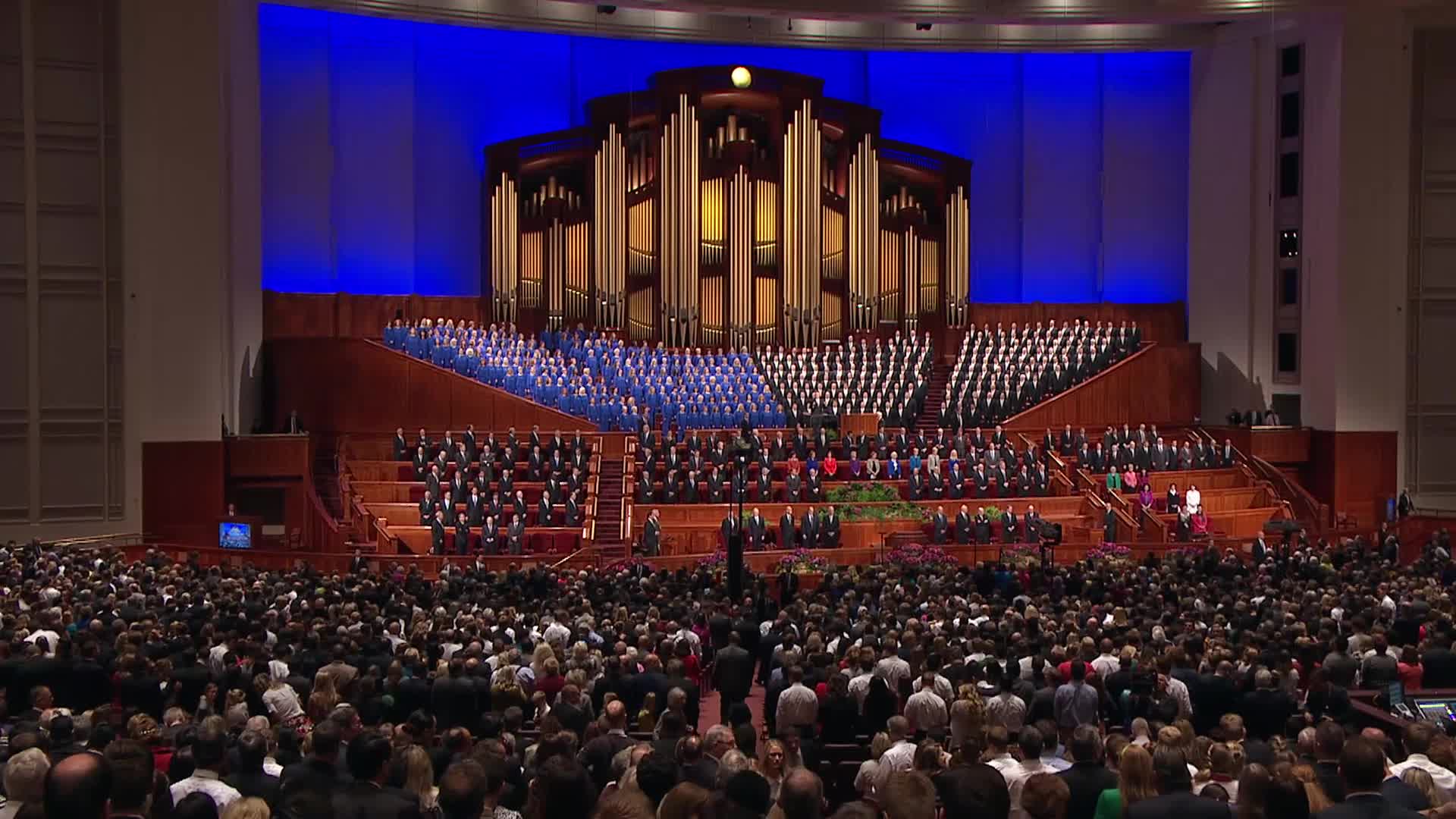 The choir and congregation sing “We Thank Thee, O God, for a Prophet.”