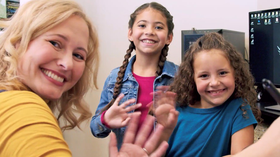 A computer screen animator shows two sisters pictures and drawings and the mixing of digital colors. Images show Jesus as a child teaching in the Jerusalem Temple in the lesson for Come, Follow Me.
