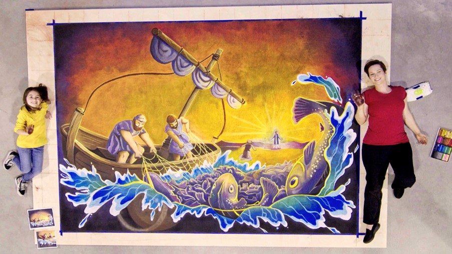 A girl meets with Sara the chalk artist. They draw a picture of Simon Peter and Andrew on their boat trying to catch fish all night. Jesus’s miracle filled their net and they became “fishers of men.”