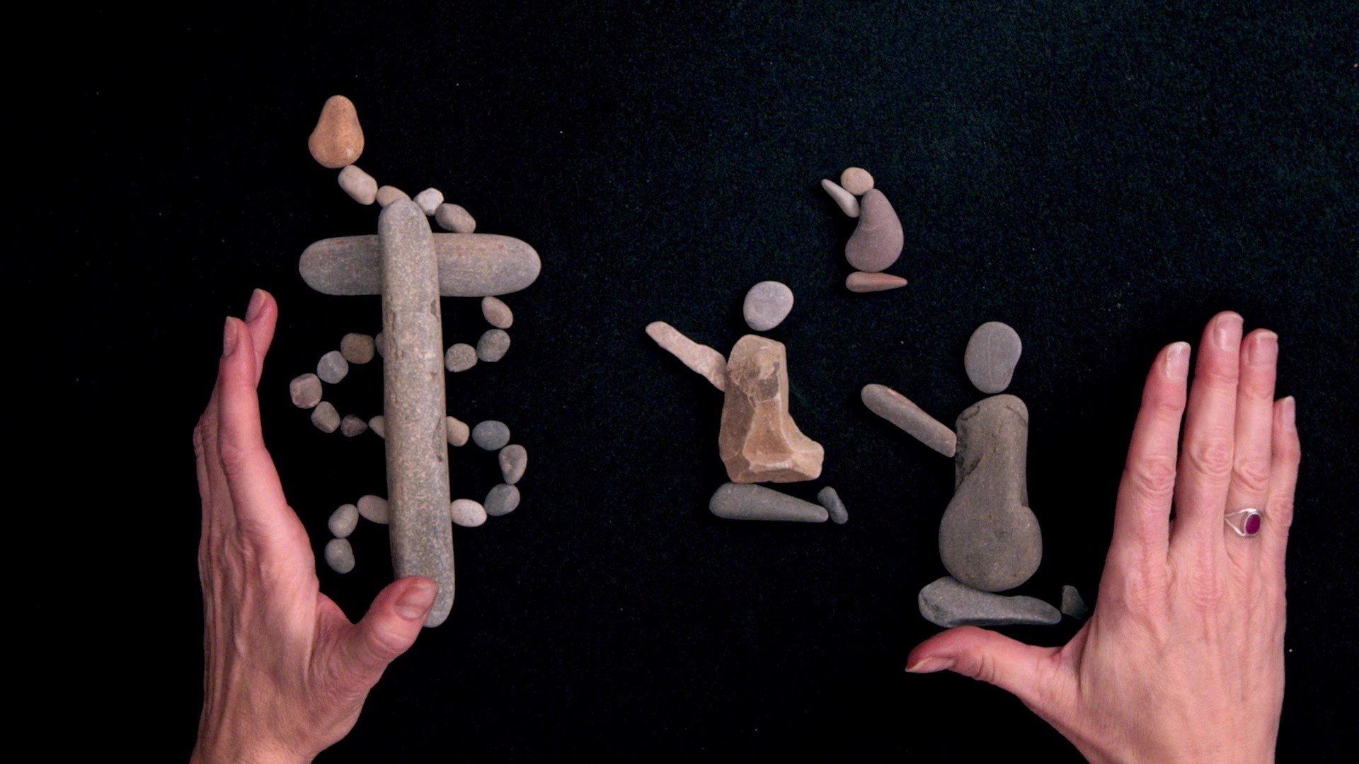 Patty Rokus the rock artist arranges stones and pebbles to show how the children of Israel prayed and followed Moses in the wilderness, and how they faced hardships with snakes.