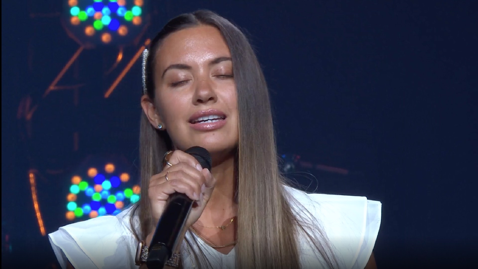 Darla Day, a female vocalist, sings “Hear Him” in English accompanied by Nik Day on piano