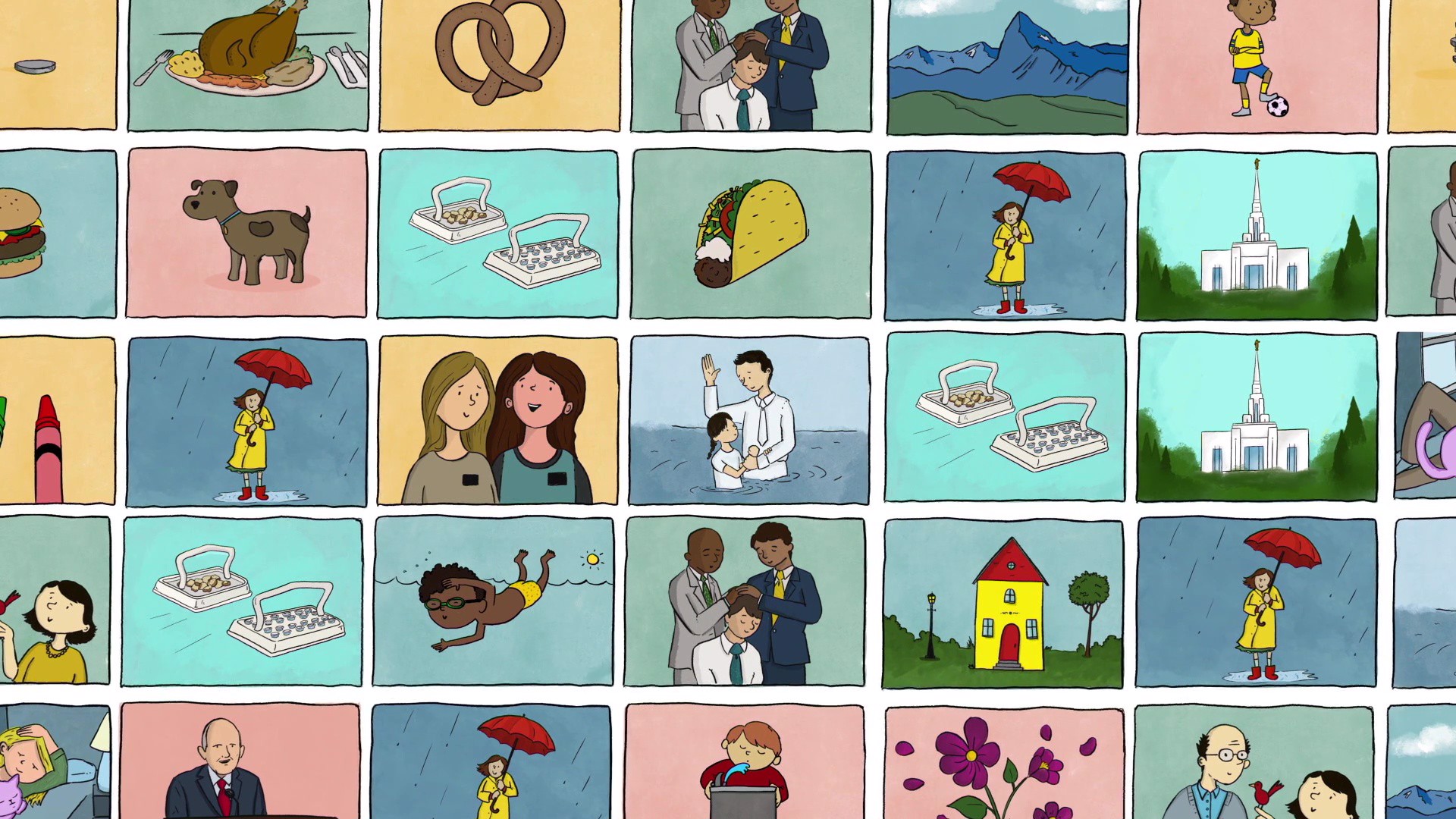 A child narrates a game based on clues and pictures that correspond with ordinances of the gospel. Sacred ceremonies like the sacrament, attending the temple, and a child baptized are included.