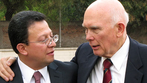 El élder Dallin H. Oaks, del Quórum de los Doce Apóstoles (derecha) habla con el presidente Rodolfo Gómez Morán de la Estaca Ciudad de México Lindavista (izquierda).