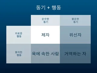 이 도표를 볼 때 저는 우리의 동기와 바람, 행동 사이의 관계를 더 쉽게 이해하게 됩니다. 제자로서 성약의 길을 걸어갈 때, 우리는 순수한 동기로 의로운 행동을 하게 됩니다. 주님과 그분의 자녀들을 사랑하기에 선한 일을 합니다. 그러나 의롭지 못한 동기로도 선한 일을 할 수 있습니다. 위선자처럼, 좋은 모습을 보이고 싶어서 또는 다른 사람들보다 더 좋게 보이고 싶기 때문에 선하게 행동하는 것입니다.