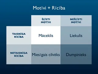 Šī shēma man palīdz saprast saikni starp motīviem jeb vēlmēm un mūsu rīcību. Kad mēs esam uz māceklības derību takas, mūsu motīvi ir šķīsti un mūsu rīcība — taisnīga. Mēs darām labus darbus, jo mēs mīlam To Kungu un Viņa bērnus. Taču ir arī iespējams darīt labus darbus, kam pamatā ir netaisnīgs motīvs. Tad mēs rīkojamies kā liekuļi, — mēs darām labus darbus, jo mēs vēlamies izskatīties labi, vai arī tāpēc, ka mēs vēlamies izskatīties labāki par kādu citu.