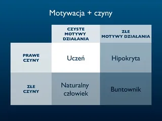 Ten diagram pomaga mi zrozumieć związek między motywami działania lub pragnieniami, a naszymi czynami. Gdy jako uczniowie podążamy ścieżką przymierza, nasze motywy są czyste, a nasze czyny prawe. Czynimy dobro, ponieważ kochamy Pana i Jego dzieci. Jednak możliwe jest także czynienie dobra ze złych pobudek. Wtedy jesteśmy hipokrytami — czynimy dobro, ponieważ chcemy dobrze wypaść przed ludźmi, bądź chcemy być lepsi od innej osoby.