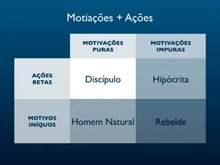 Este diagrama me ajuda a compreender a relação que existe entre nossas motivações ou nossos desejos e nossas ações. Quando estamos no caminho de convênio do discipulado, nossas motivações são puras e nossas ações são retas. Fazemos coisas boas porque amamos o Senhor e Seus filhos. Mas também é possível fazer uma coisa boa por um motivo iníquo. Então, estamos agindo como hipócritas — fazemos o bem porque queremos parecer bons, ou porque queremos parecer melhores que outra pessoa.