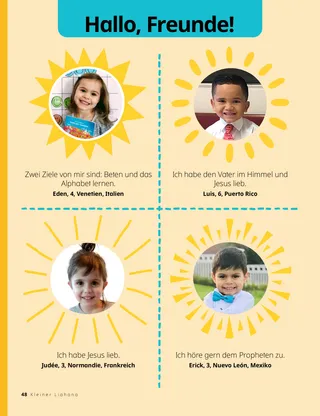 Hallo, Freunde! Zwei Ziele von mir sind: Beten und das Alphabet lernen. Eden, 4, Venetien, Italien Ich habe den Vater im Himmel und Jesus lieb. Luis, 6, Puerto Rico Ich habe Jesus lieb. Judée, 3, Normandie, Frankreich Ich höre gern dem Propheten zu. Erick, 3, Nuevo León, Mexiko Als PDF öffnen