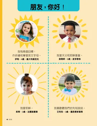 朋友,你好! 我有兩個目標:作祈禱和學習英文字母。 伊甸,4歲,義大利威尼托 我愛天父和耶穌基督。 路易斯,6歲,波多黎各 我愛耶穌。 茱蒂,3歲,法國諾曼第 我喜歡聽我們的先知說話。 艾利克,3歲,墨西哥新雷昂 開啟PDF