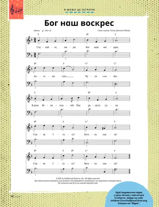 Я можу це зіграти! Бог наш воскрес Слова і музика Телми Джонсон Райзер Радісно: [четвертна нота] = 104–112 Відкрити PDF-файл Слухайте, люди: Бог наш воскрес. Ангелів спів, Чути з небес. В день Великодній Нас радість єдна. В день Великодній Нас радість єдна.