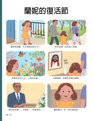 蘭妮的復活節 蘭妮很興奮,今天是復活節主日! 她和爸媽一起走路上教會。 她看到很多小花、小鳥和昆蟲。 在教會裡,她看到耶穌的畫像。 「復活節快樂,」主教說,「耶穌愛你!」 蘭妮會心一笑,她也愛耶穌! 耶穌愛人和醫治人 耶穌無論到哪裡都教導和醫治人。祂最後一次去耶路撒冷時,人們高高揮舞著棕櫚葉,表達對祂的愛、敬意和尊重。 你會跟著耶穌的腳步走進耶路撒冷嗎? 凱瑟琳·米特繪