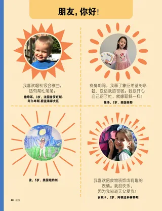 朋友,你好! 我喜欢唱初级会歌曲,还有帮忙弟弟。 撒母耳,3岁,法国普罗旺斯-阿尔卑斯-蔚蓝海岸大区 疫情期间,我画了象征希望的彩虹,送给我的邻居。我很开心自己帮了忙,就像耶稣一样! 薇洛,5岁,英国柴郡 波,5岁,美国纽约州 我喜欢把食物装饰成有趣的表情。我很快乐,因为我知道天父爱我! 安妮卡,5岁,阿根廷科林特斯 开启PDF