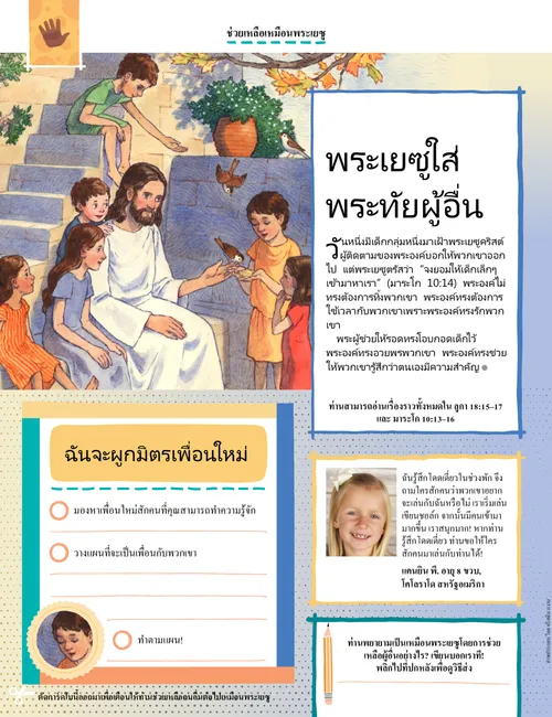 พระผู้ช่วยให้รอดทรงโอบกอดเด็กไว้ พระองค์ทรงอวยพรพวกเขา พระองค์ทรงช่วยให้พวกเขารู้สึกว่าตนเองมีความสำคัญ