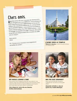 Avril 2021 Chers amis Russell M. NelsonAimer tous les enfants de Dieu Amber HealeyUne nouvelle amie pour Wellington Moment amusant avec les Écritures Alelie CamitanLe rappel de CLB Visite de frère Bednar en Amérique centrale Trouve-les ! Linda DaviesFais la connaissance de Shiloh, des Philippines Jésus était accueillant Aventures aux Philippines avec Margo et Paolo Heather MerkleyLe solo de sœurs Cartes de l’histoire de l’Église Par-dessus le bâton ! Une idée brillante Isabella S.Je reverrai mon frère Jane McBrideProblème au ruisseau À ne pas oublier Brook P. HalesLa grande question du bowling L’heure des activités ! La parole est à toi Matt et Mandy Pour les plus grands Lucy Stevenson EwellJulia Mavimbela Raihau T.J’ai joué un cantique Devenir grand et fort Haley YanceyBraden ouvre la voie Termine les dessins Pour les tout-petits Une carte pour Grand-Maman Les missionnaires ont annoncé l’Évangile Je ferai connaître l’Évangile. Sinéad PoznanskiJe connais un chant sur cette histoire ! Bonjour les amis ! Moment amusant avec les Écritures pour les tout-petits Chers Parents