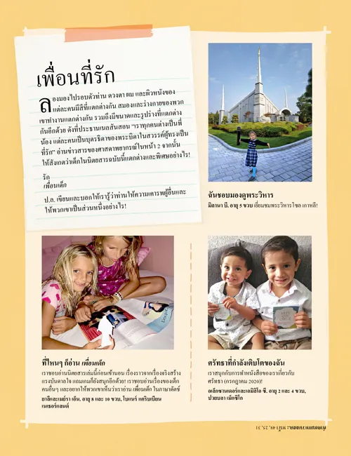 เมษายน 2021 เพื่อนที่รัก รัสเซลล์ เอ็ม. เนลสันความรักต่อลูกๆ ทุกคนของพระผู้เป็นเจ้า แอมเบอร์ เฮลีย์เพื่อนใหม่ของเวลลิงตัน สนุกกับช่วงเวลาพระคัมภีร์ อเลลี คามิตันสิ่งเตือนใจจากลสด. เอ็ลเดอร์เบดนาร์เยือนทวีปอเมริกากลาง หาให้เจอ! ลินดา เดวีสพบกับชิโลห์จากฟิลิปปินส์ พระเยซูใส่พระทัยผู้อื่น การผจญภัยในฟิลิปปินส์กับมาร์โกและเปาโล เฮเธอร์ เมิร์คลีย์ซิสเตอร์โซโล การ์ดประวัติศาสนจักร กระโดดข้ามไม้! คมวาทะ อิซาเบลลา เอส.ฉันจะพบน้องชายของฉันอีกครั้ง เจน แม็คไบรด์ปัญหาที่ลำห้วย สิ่งที่พึงจดจำ บรูค พี. เฮลส์คำถามสำคัญเรื่องการโยนโบว์ลิ่ง ช่วงกิจกรรม! เล่าสู่กันฟัง แมทท์และแมนดี สำหรับเด็กโต ลูซี สตีเวนสัน อีเวลล์จูเลีย มาวิมเบลา ไรฮาอู ที.ผมเล่นเพลงสวด เติบโตอย่างเต็มที่และแข็งแกร่ง เฮลีย์ ยันซีย์เบรเดนนำทาง เติมภาพให้สมบูรณ์ สำหรับเด็กเล็ก การ์ดสำหรับคุณยาย ผู้สอนศาสนาแบ่งปันพระกิตติคุณ ฉันสามารถแบ่งปันพระกิตติคุณ ชิเนด พอซนานสกีหนูรู้จักเพลงเกี่่ยวกับเรื่องนั้น! สวัสดีเพื่อนๆ สนุกกับช่วงเวลาพระคัมภีร์สำหรับเด็กเล็ก เรียน บิดามารดาทุกท่าน