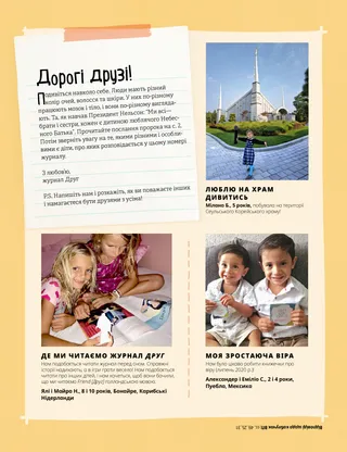 Квітень 2021 Дорогі друзі! Рассел М. НельсонЛюбов до всіх Божих дітей Ембер ХейліНовий друг для Веллінгтона Час цікавого вивчення Писань Алелі КамітанНагадування у вигляді каблучки ВП Старійшина Беднар відвідує Центральну Америку Знайди це на малюнку! Лінда ДейвісЗнайомтеся: Шайло з Філіппін Ісус запрошував усіх Пригоди на Філіппінах з Марго і Паоло Хезер МеркліСоло сестер Картки з історії Церкви Перестрибни палицю! Чудова ідея Ізабелла С.Я знову побачу свого брата Джейн Мак-БрайдНебезпека біля річки Що слід пам’ятати Брук П. ХейлзВелике питання про боулінг Час для заходів! Покажи й розкажи Метт і Менді Для дітей старшого віку Люсі Стівенсон ІвеллДжулія Мавімбела Райхау Т.Я зіграв гімн! Рости високими й сильними Хейлі ЯнсіБрейден показує приклад Домалюй Маленьким друзям Листівка для бабусі Місіонери ділилися євангелією Я можу ділитися євангелією Шінед ПознаньскіЯ знаю пісню про це! Привіт, друзі! Веселе вивчення Писань для маленьких Шановні батьки!