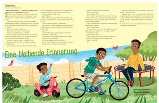 Zamu stellte sein Rad ab und nahm Zinathis Hand. Er half seinem kleinen Bruder auf das Trampolin. Dann kletterte er selbst hoch und setzte sich neben Papa.