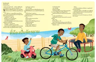 ซามูปั่นจักรยานสีฟ้าลัดสนามอย่างรวดเร็ว ซินาทีน้องชายวัยสองขวบของเขาใช้เท้าถีบรถสคูเตอร์สีแดงตามหลังมา