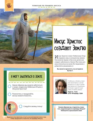 Иисус Христос помог Небесному Отцу создавать мир, в котором мы живем. Они велели Адаму и Еве и их детям как следует заботиться о Земле. Мы тоже должны относиться ко всем Их творениям с добротой и уважением.