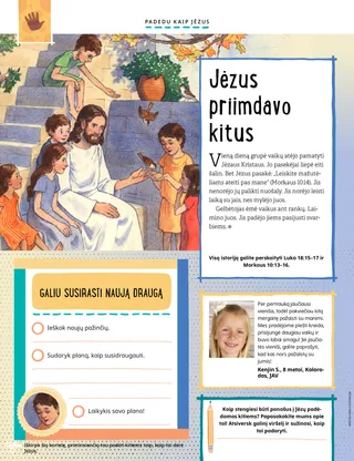 Vieną dieną grupė vaikų atėjo pamatyti Jėzaus Kristaus. Jo pasekėjai liepė eiti šalin. Bet Jėzus pasakė: „Leiskite mažutėliams ateiti pas mane“ (Morkaus 10:14). Jis nenorėjo jų palikti nuošaly. Jis norėjo leisti laiką su jais, nes mylėjo juos.