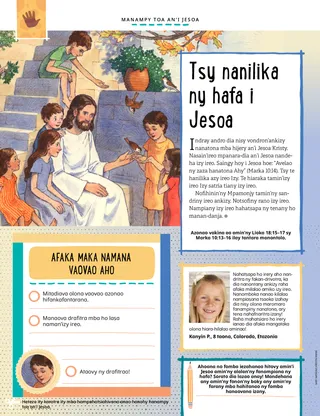Indray andro dia nisy vondron’ankizy nanatona mba hijery an’i Jesoa Kristy. Nasain’ireo mpanara-dia an’i Jesoa nandeha izy ireo. Saingy hoy i Jesoa hoe: “Avelao ny zaza hanatona Ahy” (Marka 10:14). Tsy te hanilika azy ireo Izy. Te hiaraka tamin’izy ireo Izy satria tiany izy ireo.