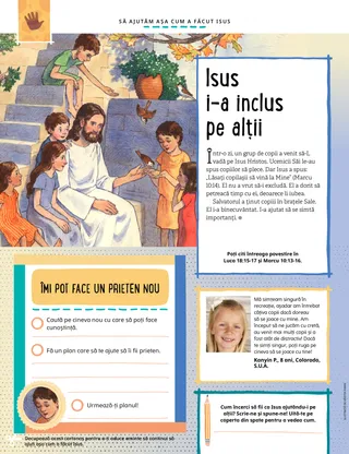 Într-o zi, un grup de copii a venit să-L vadă pe Isus Hristos. Ucenicii Săi le-au spus copiilor să plece. Dar Isus a spus: „Lăsați copilașii să vină la Mine” (Marcu 10:14). El nu a vrut să-i excludă. El a dorit să petreacă timp cu ei, deoarece îi iubea.
