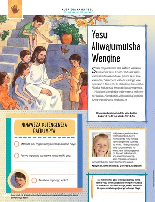 Siku moja kikundi cha watoto walikuja kumwona Yesu Kristo. Wafuasi Wake waliwaambia waondoke. Lakini Yesu akawaambia, “Waacheni watoto wadogo waje kwangu” (Marko 10:14). Hakutaka kuwaacha. Alitaka kukaa nao kwa sababu aliwapenda.