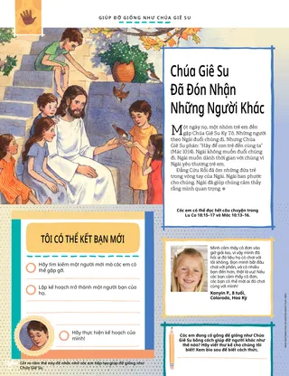 Một ngày nọ, một nhóm trẻ em đến gặp Chúa Giê Su Ky Tô. Những người theo Ngài đuổi chúng đi. Nhưng Chúa Giê Su phán: “Hãy để con trẻ đến cùng ta” (Mác 10:14). Ngài không muốn đuổi chúng đi. Ngài muốn dành thời gian với chúng vì Ngài yêu thương trẻ em.