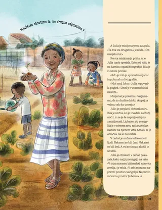 Julia je otrokom v cerkvi pokazala, kako naj ji pomagajo na vrtu. »V srcu moramo biti mehki kakor ta zemlja,« je rekla. »V sebi moramo napraviti prostor evangeliju. Napraviti moramo prostor ljubezni.«