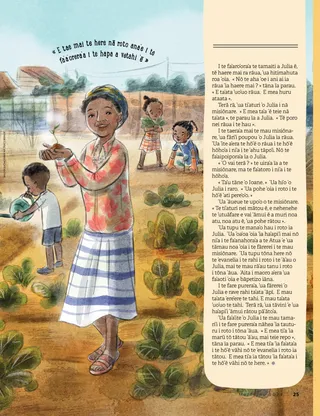 I te hō’ē mahana, ’ua fārerei ’o Julia e piti nā feiā ’āpī tamāroa. ’Ua māere ’o Julia i te mea ē, e mea varavara te ta’ata ’uo’uo i te haere mai nā tō rātou vāhi. ’Ua parau mai ra rāua ē, e misiōnare rāua. ’Ua ani atu ra ’oia ia rāua ’ia hōro’a i tā rāua poro’i i tōna fare.