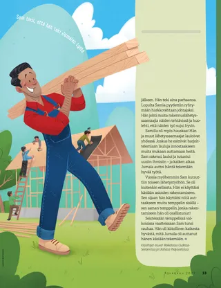 Sam kantoi kasan lautoja rakennustyömaalle ja laski ne alas. Toistaiseksi työmaalla seisoi vasta puinen kehikko, mutta pian kehikosta ja laudoista syntyisi oikea rakennus. Sam ei voinut kuvitella parempaa tapaa viettää lauantaita kuin auttaa uuden kappelin rakentamisessa!