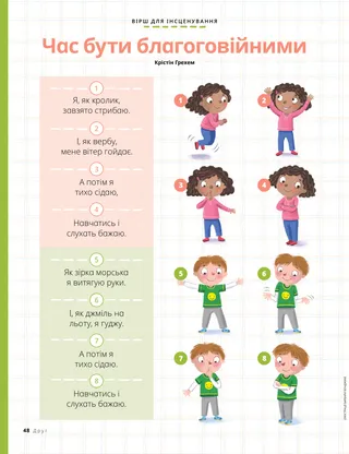 Вірш для інсценування Час бути благоговійними Крістін Грехем Я, як кролик, завзято стрибаю. І, як вербу, мене вітер гойдає. А потім я тихо сідаю, Навчатись і слухать бажаю. Як зірка морська я витягую руки. І, як джміль на льоту, я гуджу. А потім я тихо сідаю. Навчатись і слухать бажаю. Відкрити PDF-файл