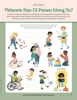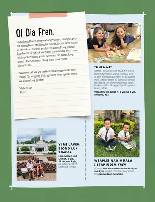 Mei/Jun 2021 Ol Dia Fren Russell M. NelsonBilif Bae I Muvumaot Ol Bigfala HilRidim wan spesel mesej blong konfrens abaot bilif we i kam long Presiden Russell M. Nelson. Amber Healey!Lok Aotsaed! Linda DaviesMitim Shiloh we i kam long Filipin Jisas I Mekem Ol Narawan Oli Pat Ol Wokbaot long Filipin wetem Margo mo Paolo Haley YanceyWan Statiu blong Jisas !Lukaotem! Tangkyu, Papa God, Yu givim Profet Raihau T.Mi Bin Plei wan Hym ?Wanem Nao Ol Presen blong Yu? Ol Samting blong Tingbaot Soem mo Talem Richard M. RomneyFutbol mo Sabat Elda Cook I Visitim Filipin Droem Josef Smit Lucy Stevenson EwellJulia Mavimbela Ol Sent Oli Bildim Wan Niu Hom Mi Save Mekem Ol Had Samting Haley YanceyBraden I Lidim Rod Isabella S.Bae Mi Luk Brata blong Mi Bakegen Ol Jos Histri Kad Ol Dia Papa mo Mama